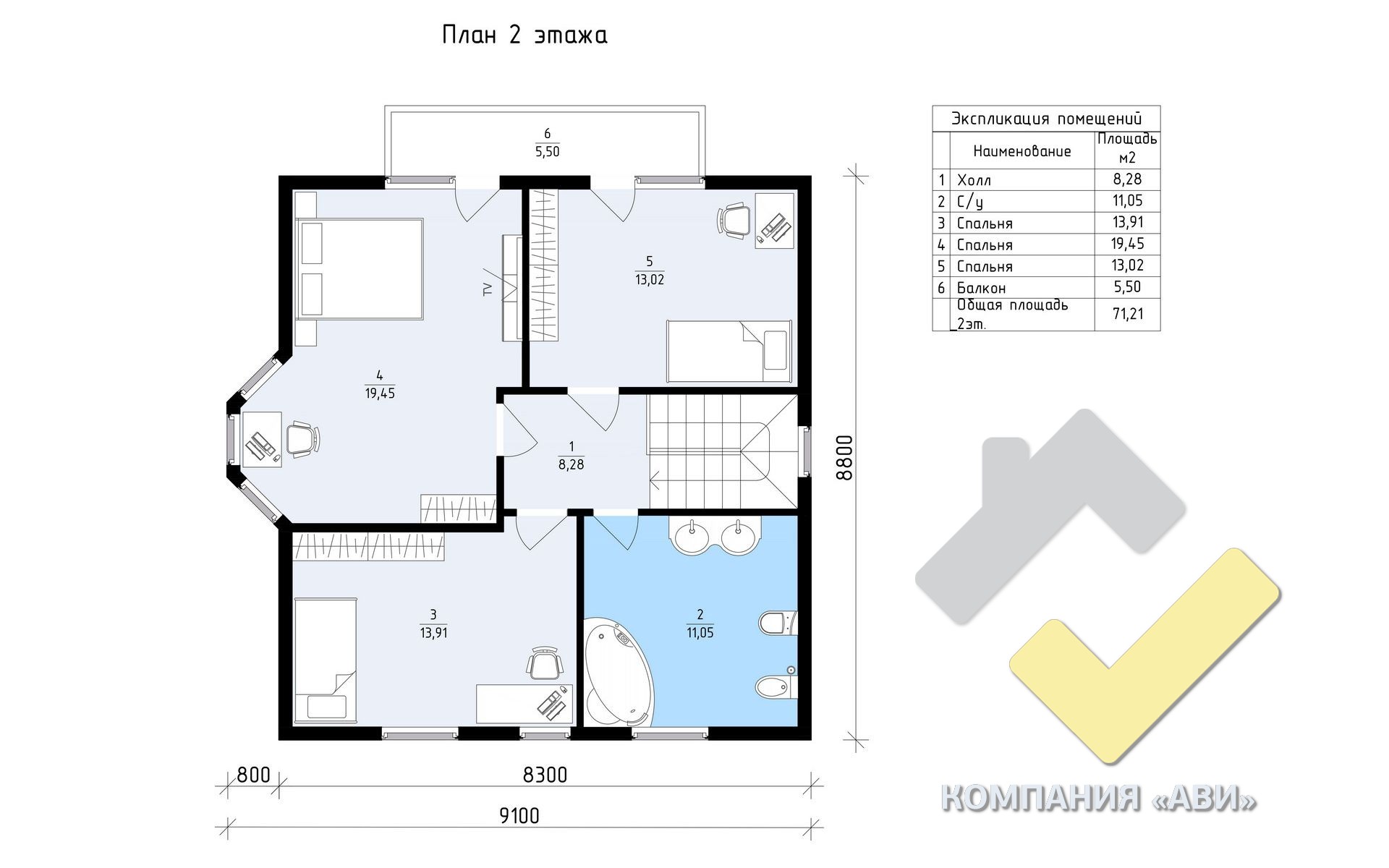 5 спальн. · 1 санузл. · 2 этаж