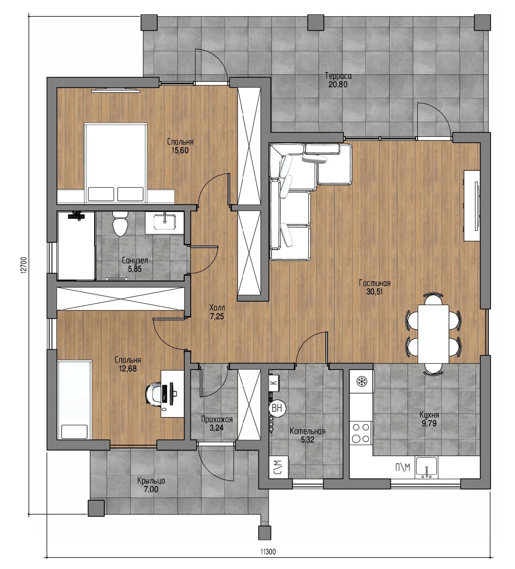 Проект одноэтажного дома с террасой Flat-01-118 м² — Домострой