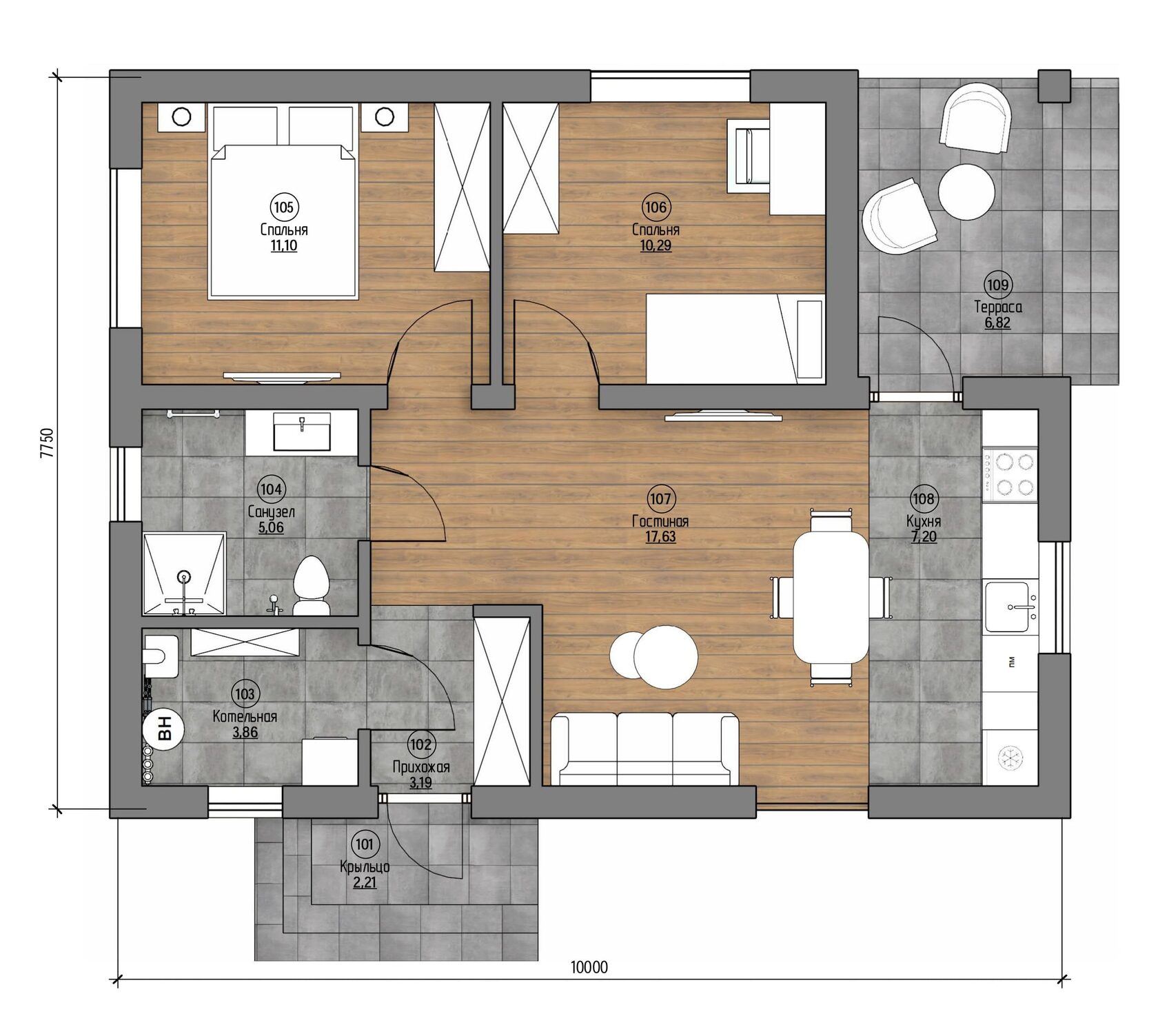 Проект одноэтажного дома с террасой Valencia-67 м² из газоблока — Домострой
