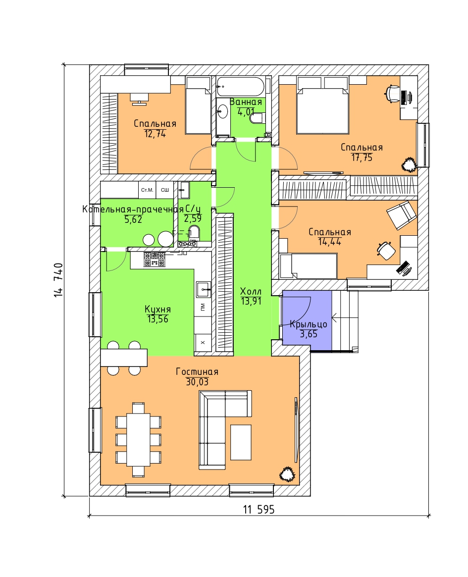 Проект одноэтажного дома с террасой Flora-115 м² из газоблока — Домострой