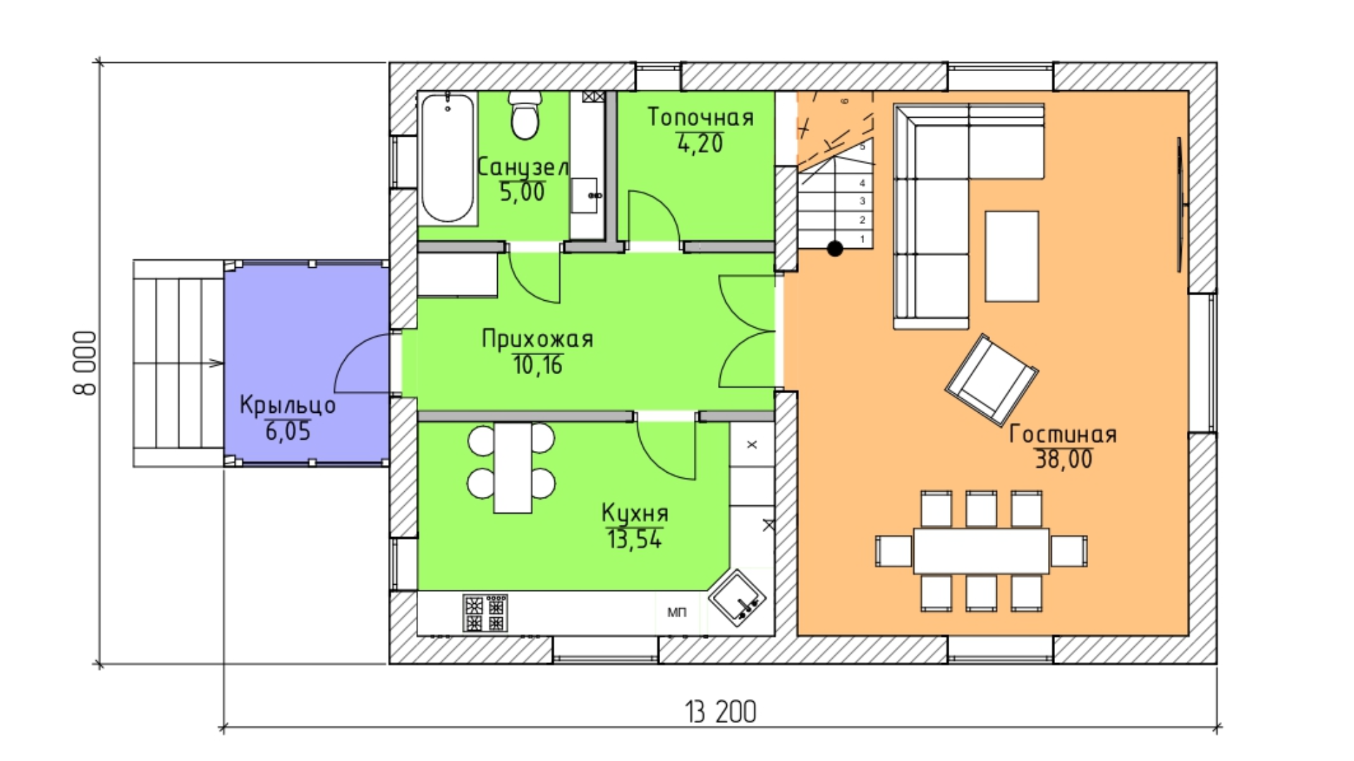 Проект одноэтажного дома "Норвежец с топочной" из бруса