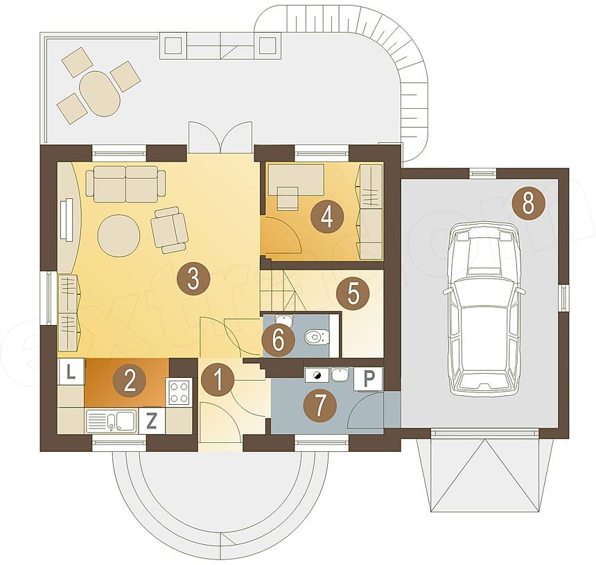 Проект одноэтажного дома с террасой Flora-115 м² из газоблока — Домострой