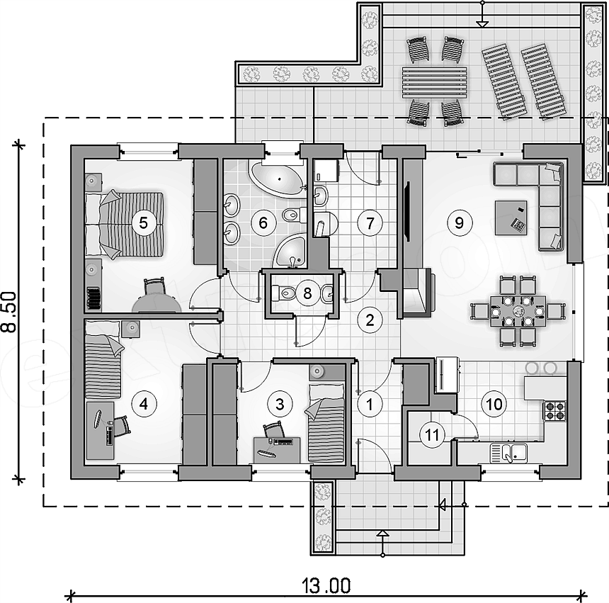 Проект одноэтажного дома с террасой Riven-111 м² из газоблока — Домострой