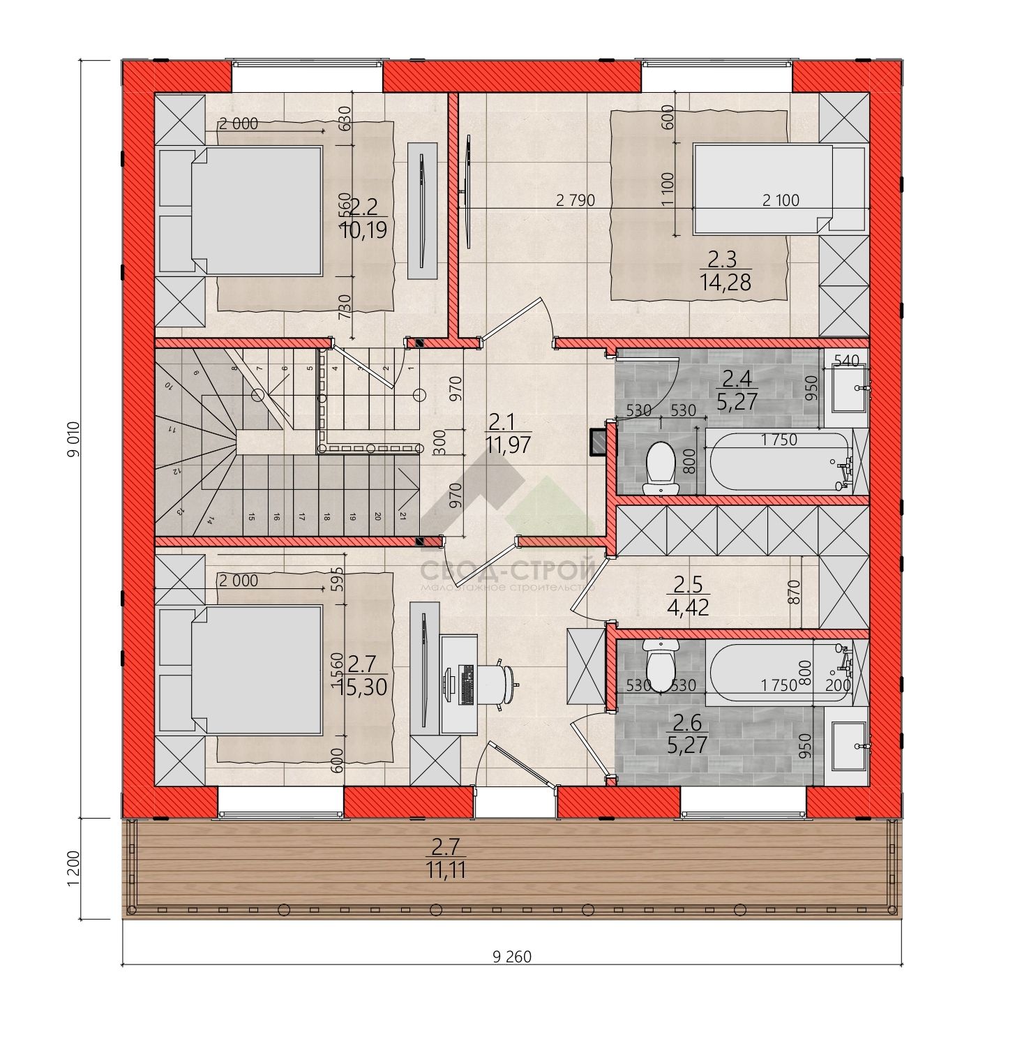 3 спальн. · 2 санузл. · 2 этаж