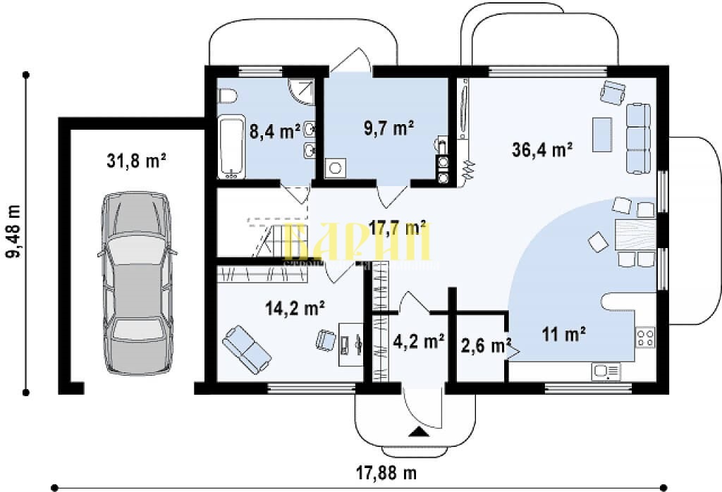 Проекты домов из газобетона Бунгало 2 M под ключ