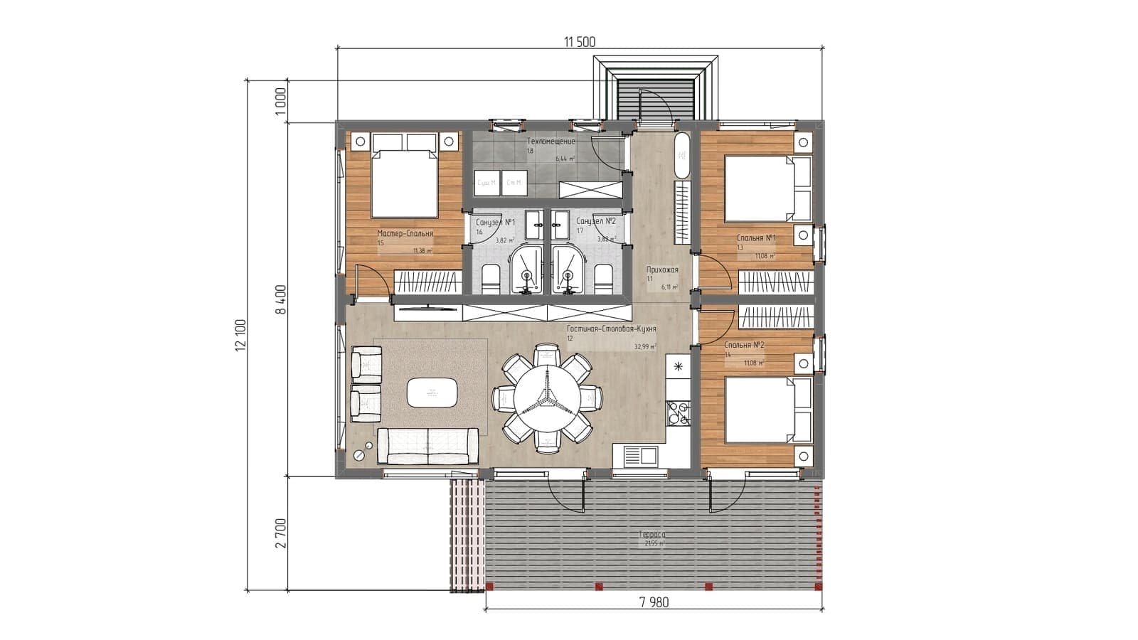 3 спальн. · 1 этаж