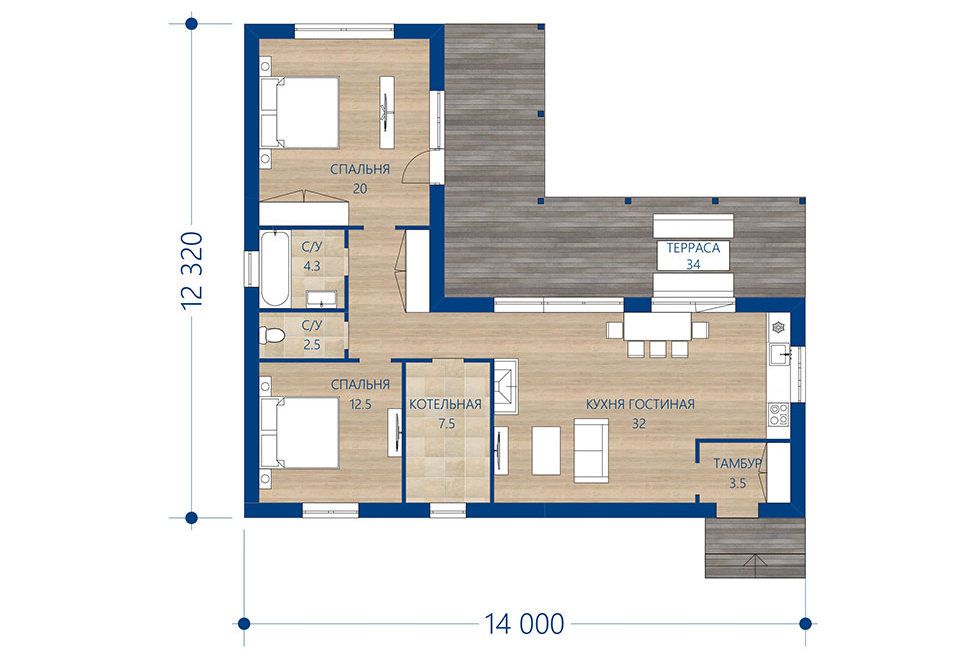 Проект одноэтажного дома "Золотой ключик-2" из бруса