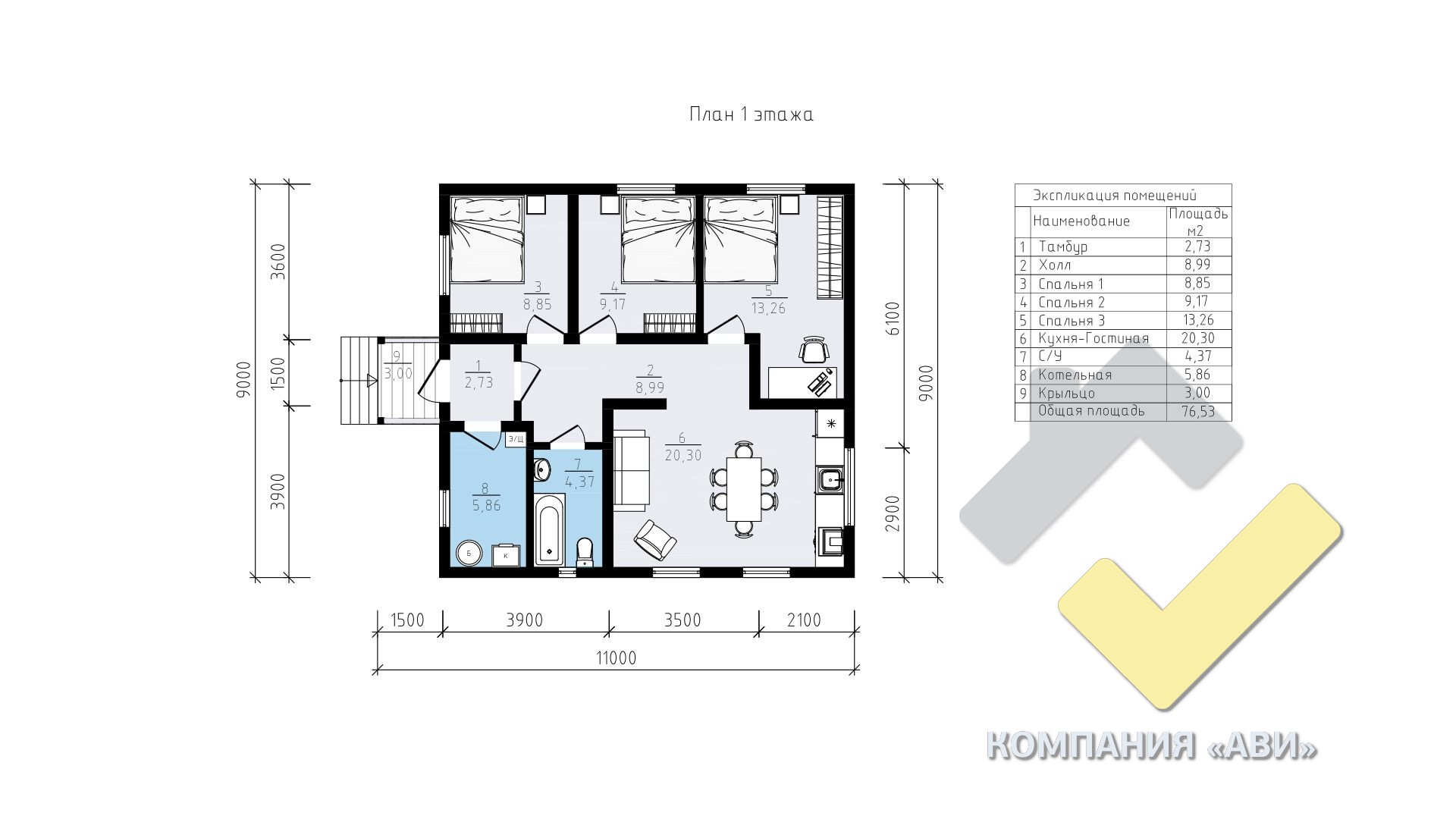3 спальн. · 1 этаж