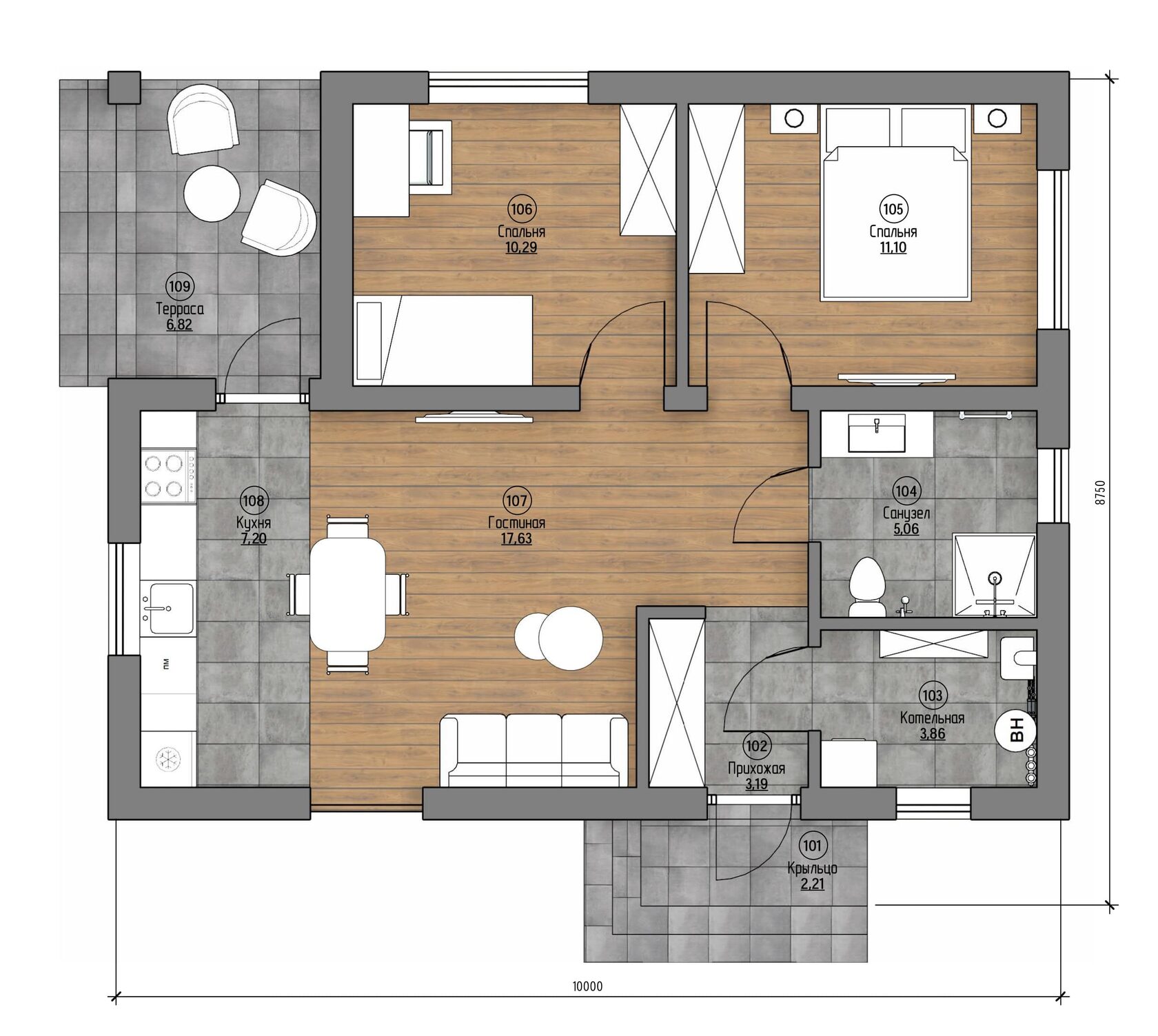 Проект одноэтажного дома с террасой Valencia-67 м² из газоблока — Домострой