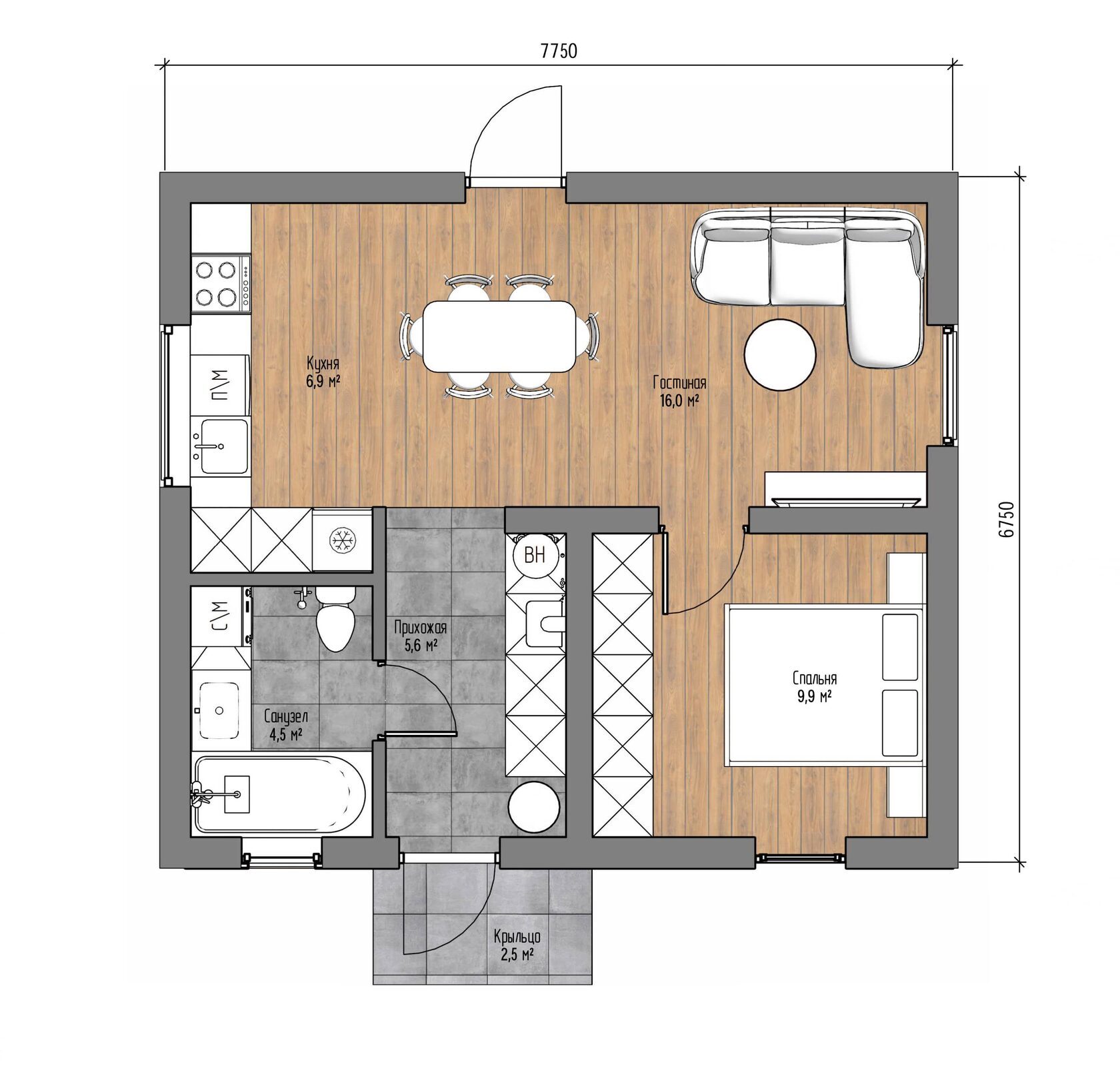 46.0 м²2 спален1 санузл.1 этажГазобетон