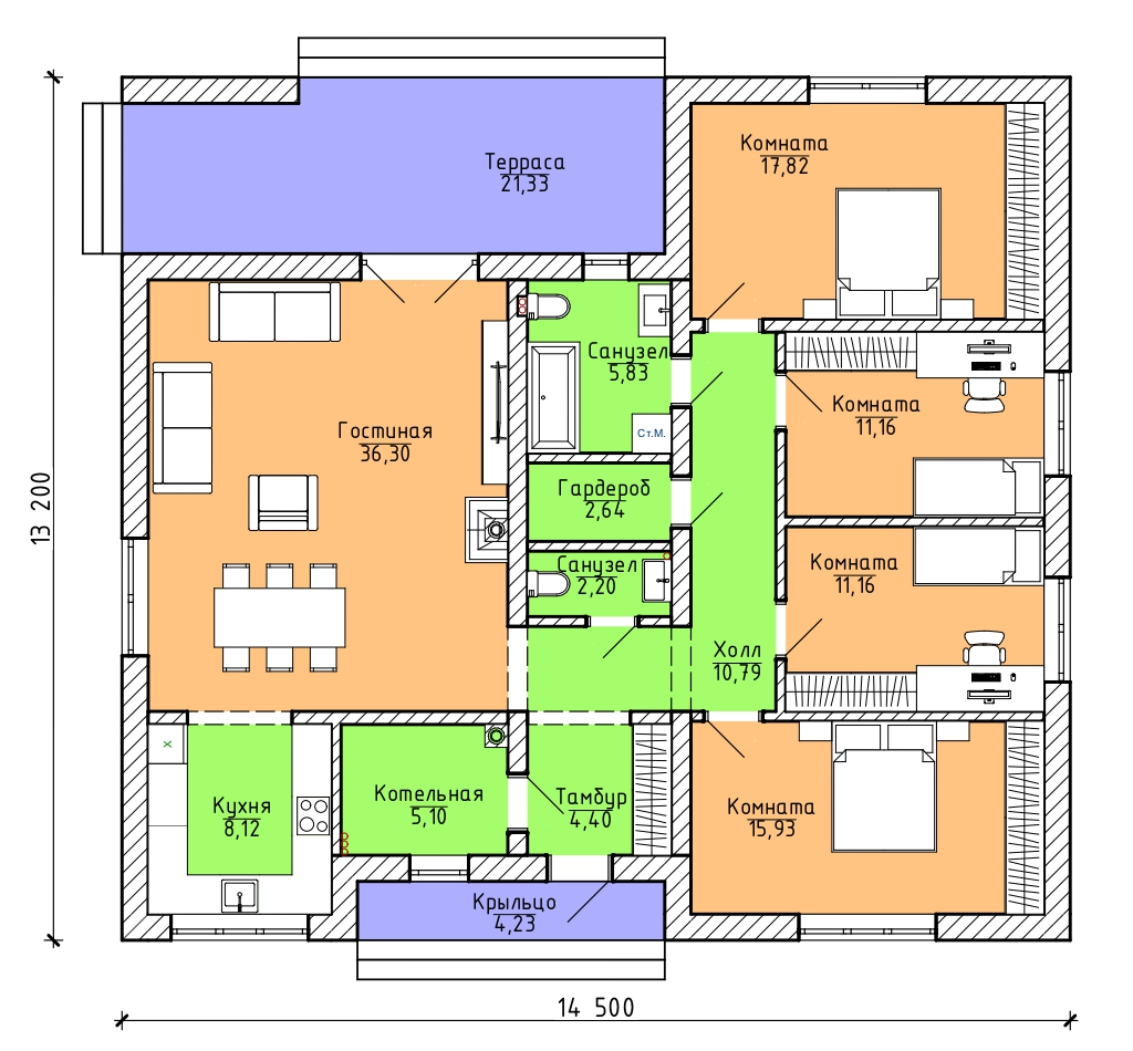Проект одноэтажного дома с террасой Flat-02-158 м² — Домострой