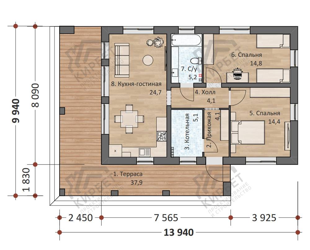 2 спальн. · 1 санузл. · 1 этаж