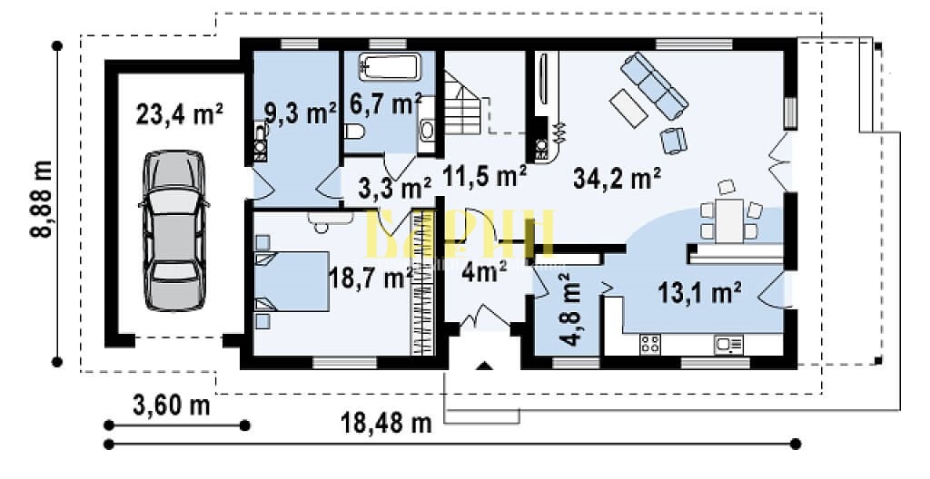 Проект одноэтажного дома "Клевер" из бруса