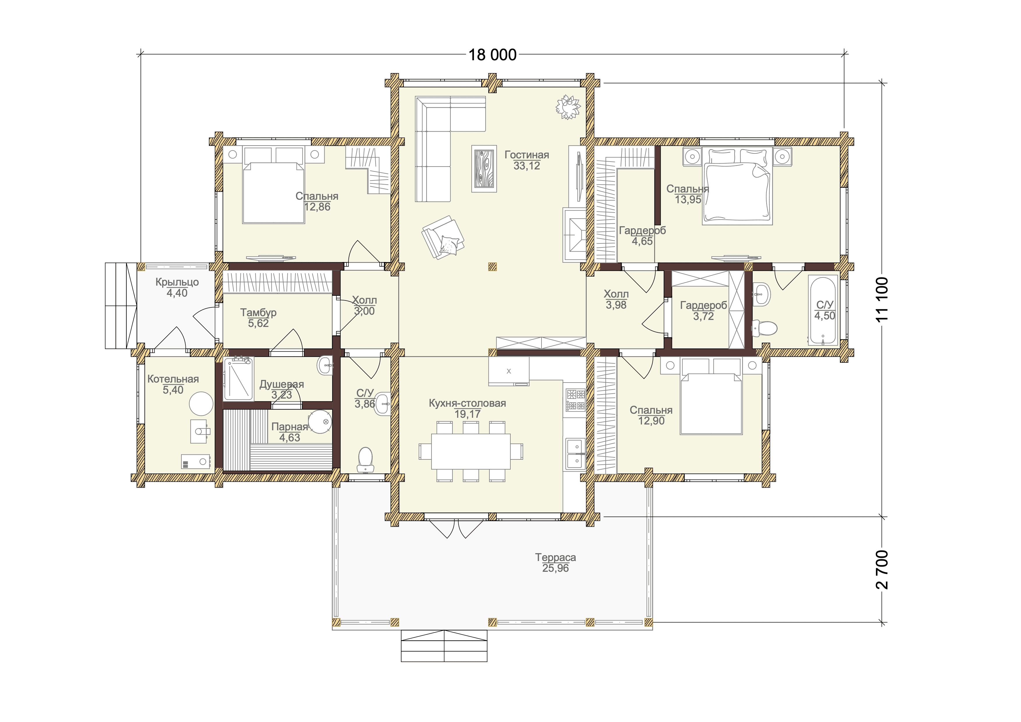 Проект одноэтажного дома "Рамиата" из бруса