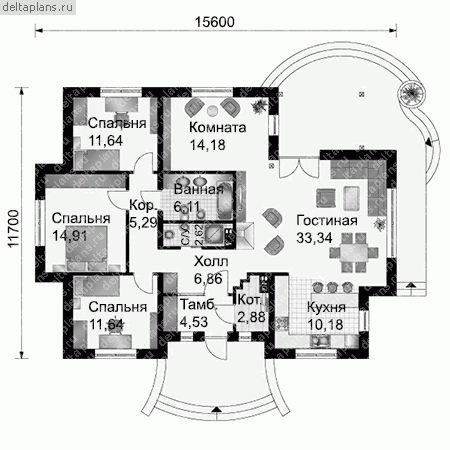 Проект одноэтажного коттеджа "Яшма КД" из газобетона