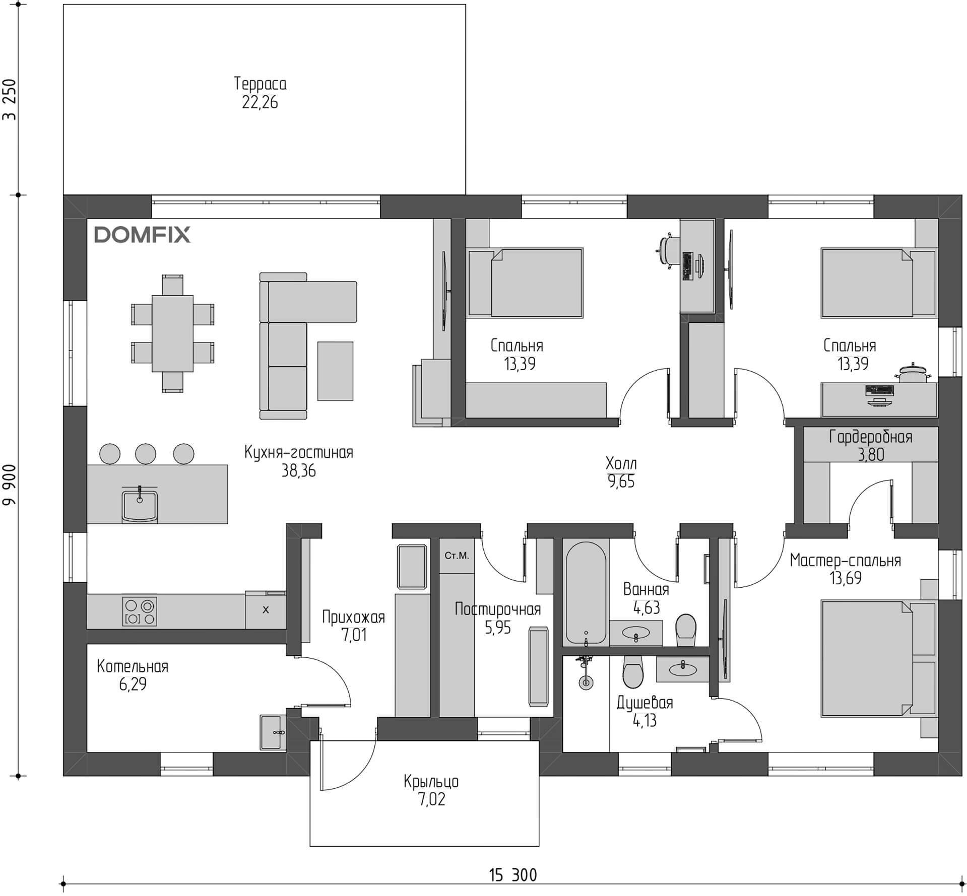 Проект DOMFIX 3 - одноэтажный каменный дом